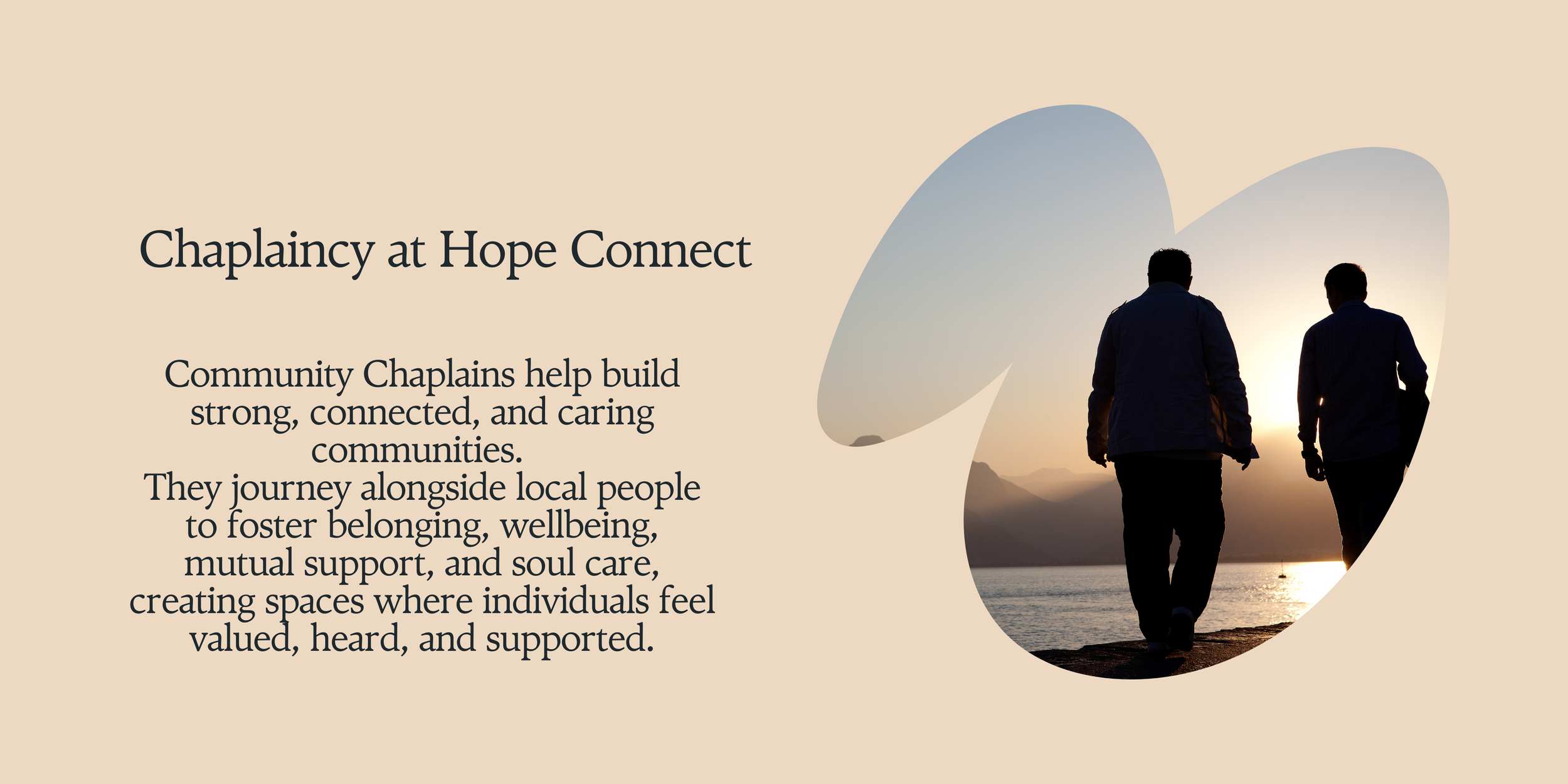 Working across community and secular settings, chaplains engage with people of all faiths and worldviews. They encourage connection, resilience, and confidence, helping communities grow their capacity to care for one another and respond positively to life’s challenges.